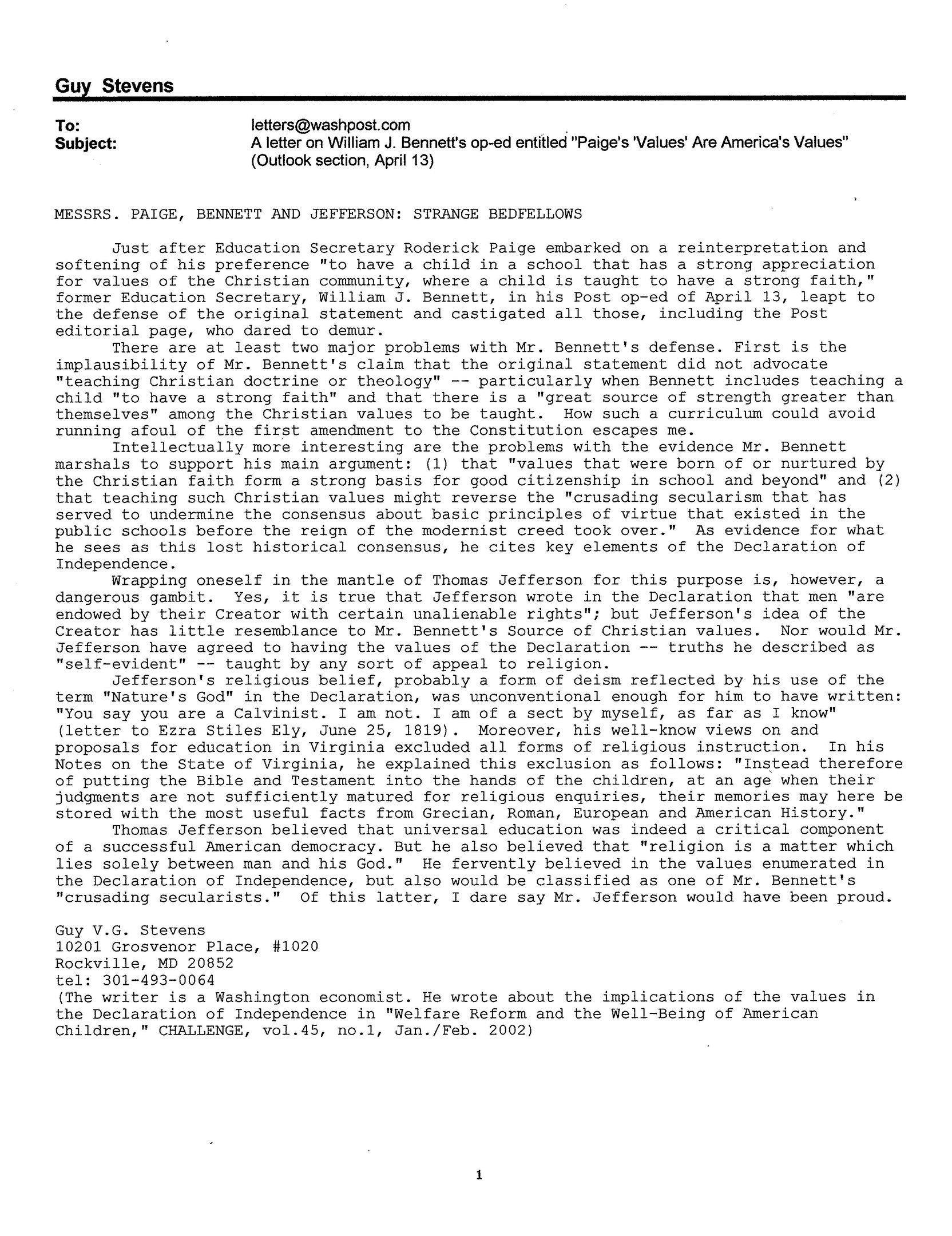 "Messrs. Paige, Bennett and Jefferson: Strange Bedfellows," (2003, Letter to The Washington Post).