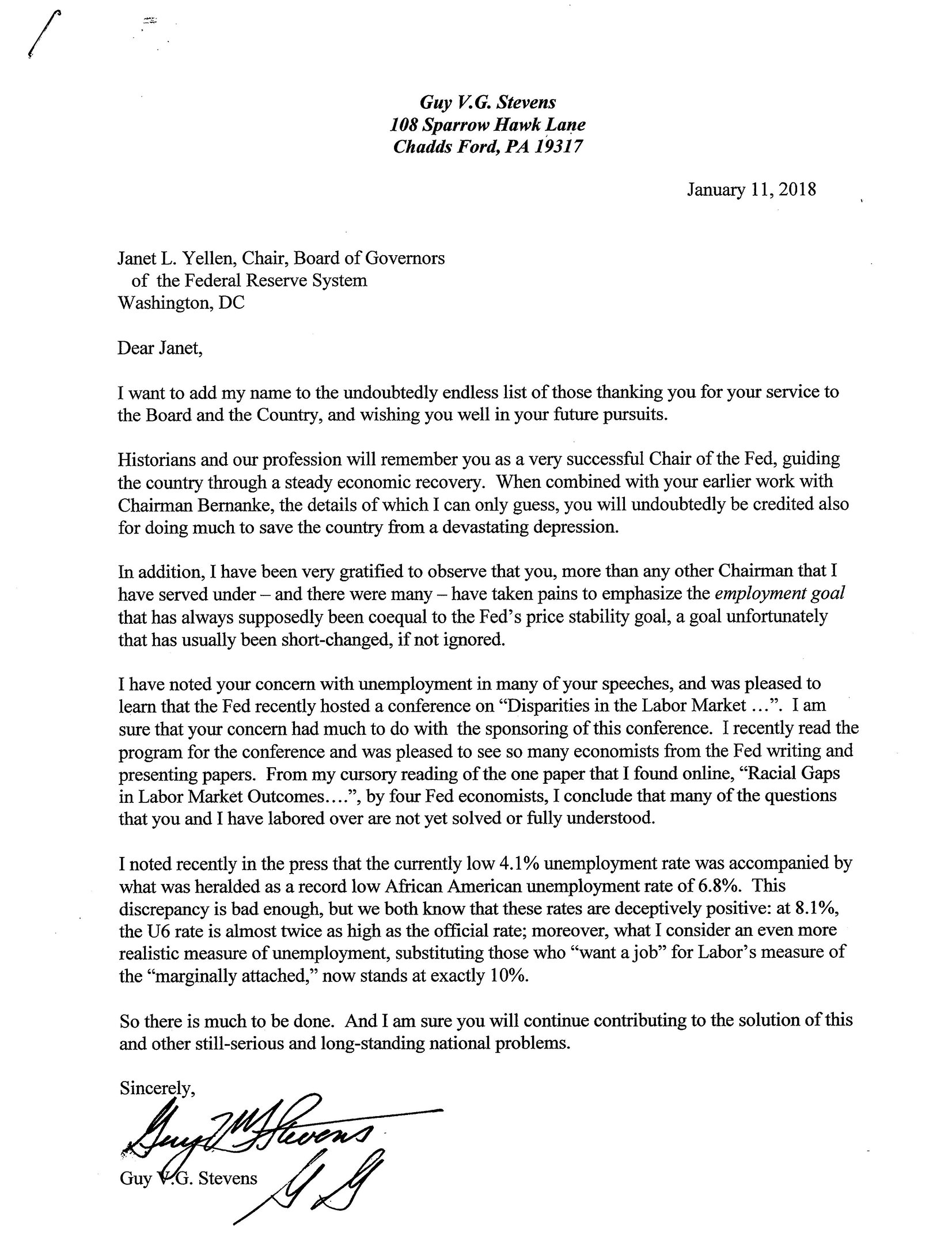 Letter to Janet L. Yellen, Chair, Federal Reserve Board (January 11, 2018).